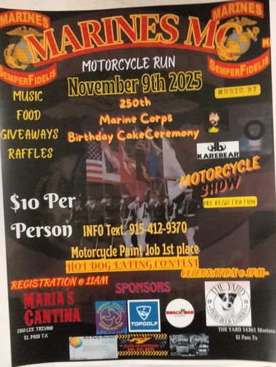 Come and join the ride and Marine BD ceremony. There will also be a Bike Show. So come on out and enjoy the great riding weather! Registration starts at 1100, $10 p/p . Details at the flyer