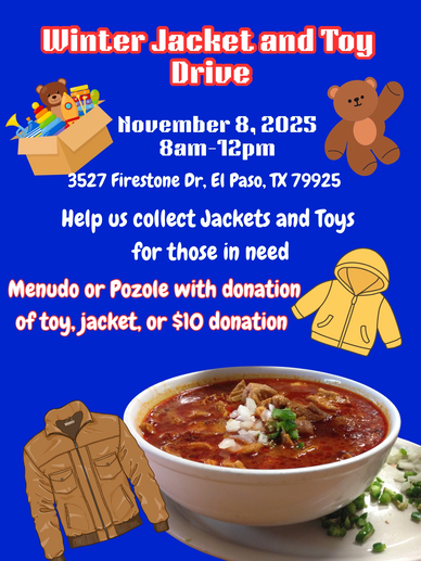 Come on out and support the New Beginnings Church drive to benefit the needy children in the area. Bring a donation, clean jacket, or toys and enjoy a tasty bowl of Menudo or Pasole. Hope to see you there! See the flyer for the details.